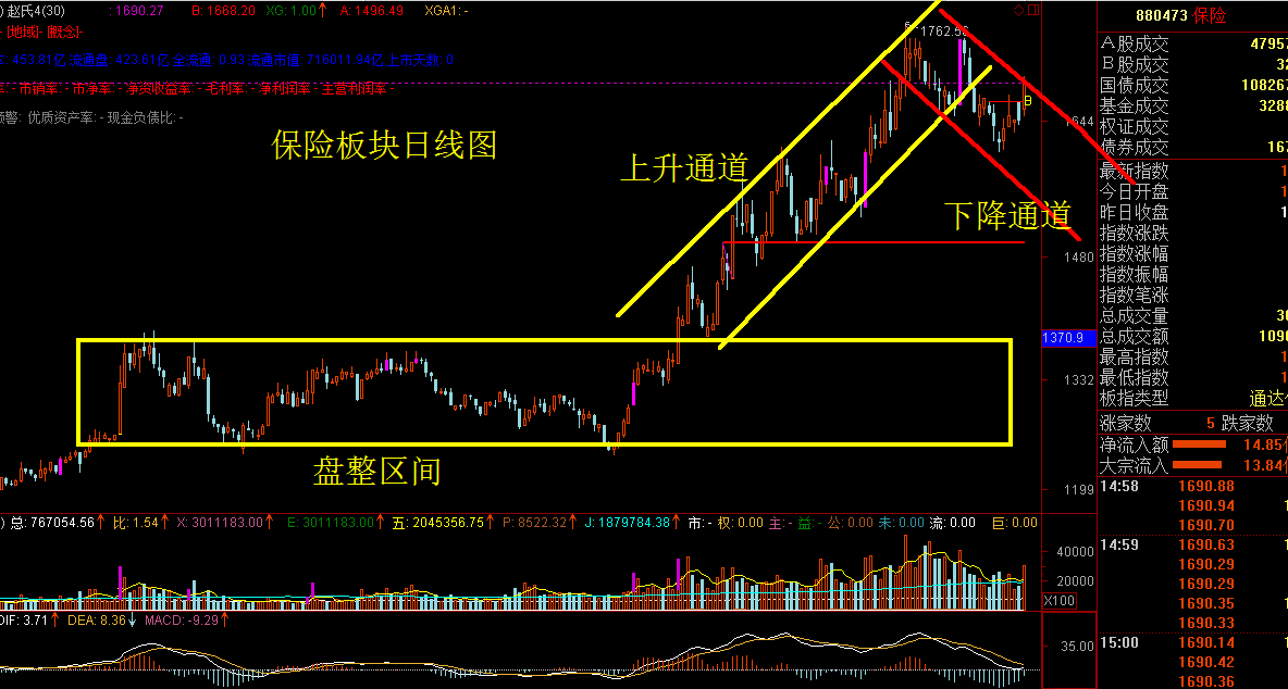 保险板块自5月10日完成突破后,进入上升通道,这个通道30分钟看的更清楚。7月17日见顶之后,形成了一个下降通道,目前价格正好反弹至下降通道的上沿,是减持的位置。