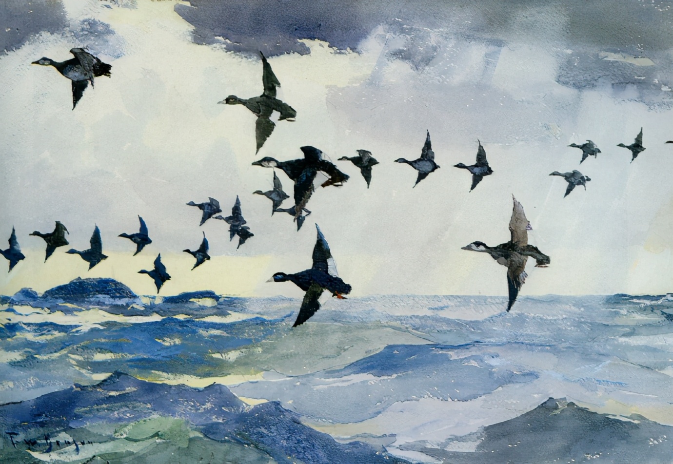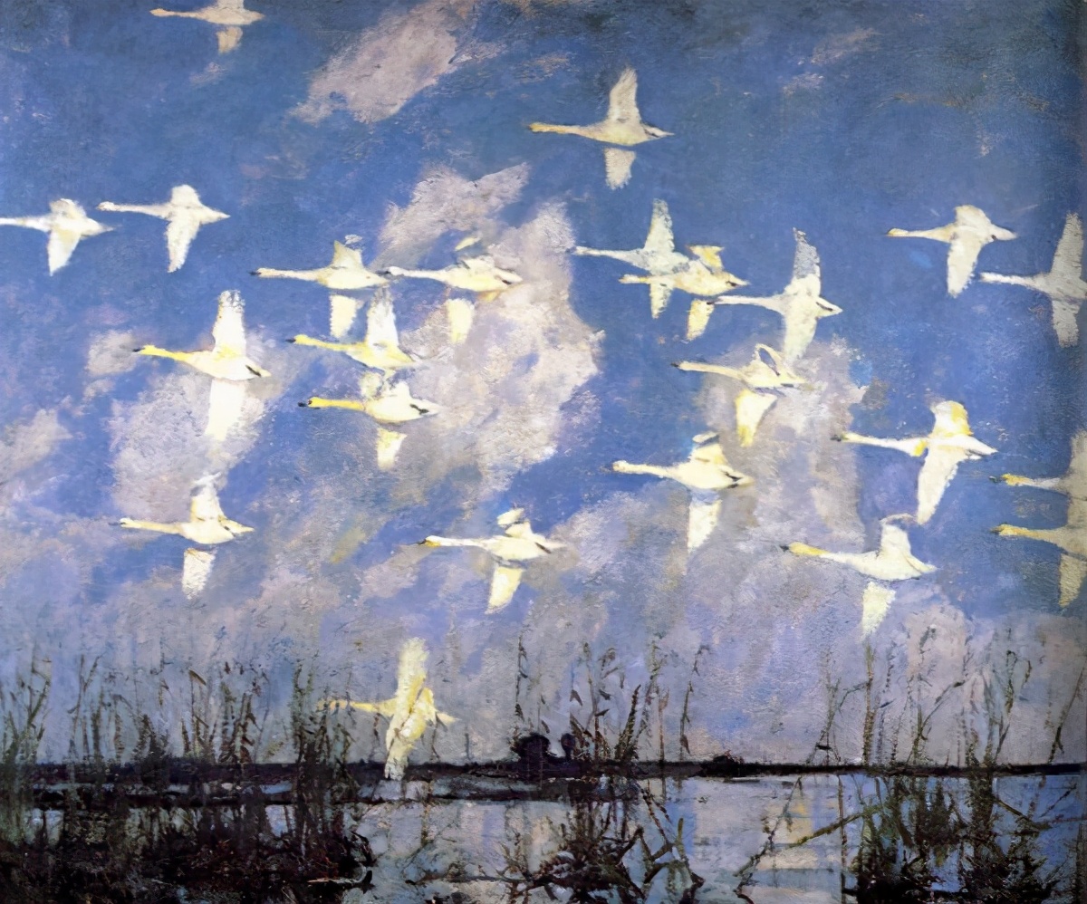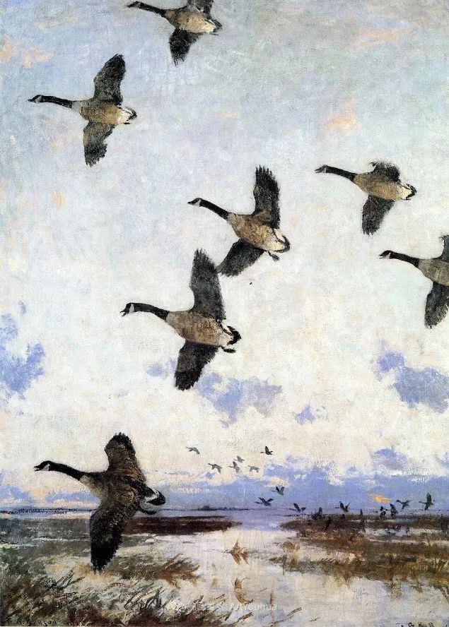 画雁会使得画家的作品增添一种灵性的东西,这种与天空为伍的禽鸟,本身的飞翔空间广阔,带着古老的诗意,就我们东方人的思维,飞鸟近天,与天帝关系密切,如同阳鸟三足乌的感觉一样。雁的背景就是有灵性的天空,使得画面不知不觉呈现一种空灵的韵味,视觉的空间也就增强,或者有时会把地平线拉得很低,渐渐整成上帝的视野。当然洋人画雁与画鹰与其它动物一样,写实的意味浓郁,这也是与东方画者不太一样的地方。