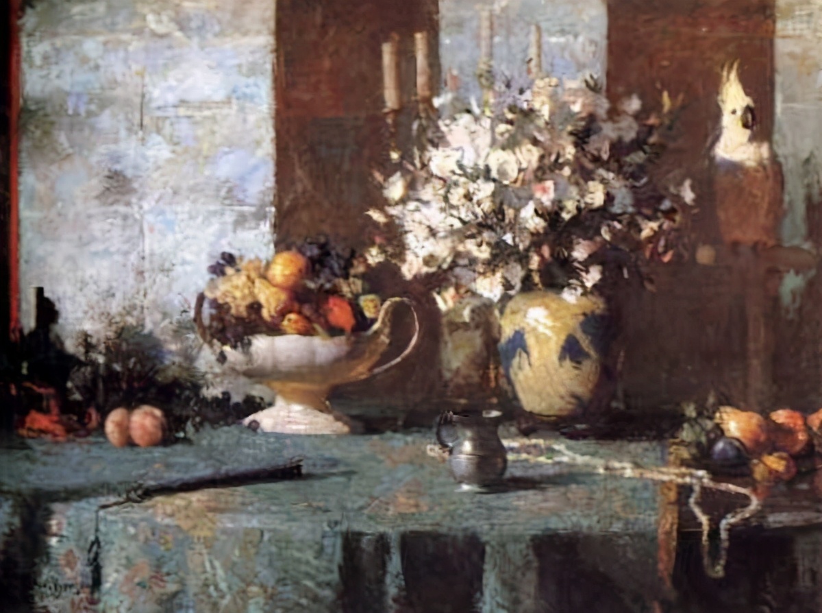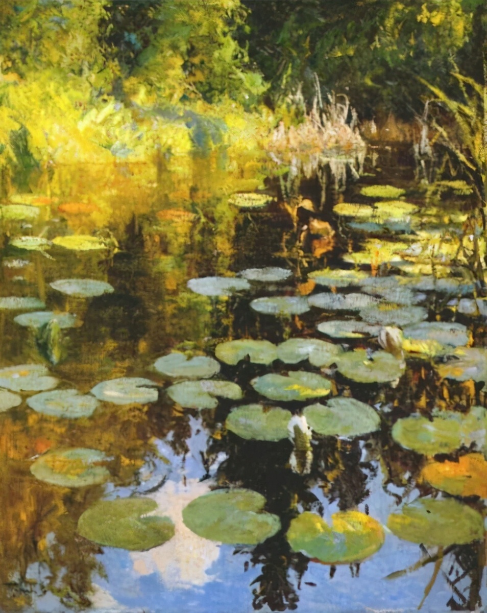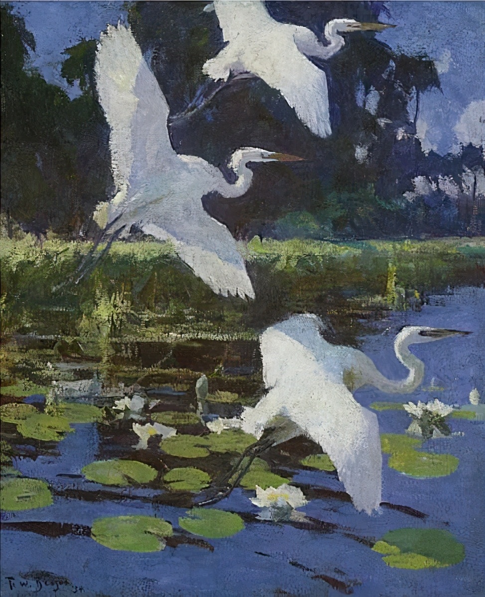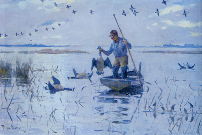 弗兰克·韦斯顿·本森曾立志作动物画家,所以他的人物还有点平庸,而与动物有关的作品,却有点诗意的,比如他的大雁系列的作品,就是一种类似中国绘画诗意充满的作品的情形,他的一幅月光下的海浪的作品,富于节奏感,诗境优雅,很有动人的情调。情调一词用在他的作品中,也是毫无违和感,因为印象派是向往东方的,但仅仅是描绘着东方服的洋妹子,那个层次尚浅,只有诗意,才是王道。