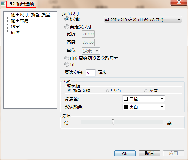 步骤五:点击“批处理”界面里的“自定义”按钮,会跳转出“PDF输出选项”弹窗,我们可以按照需要自定义设置PDF输出的尺寸、颜色、质量等。早到满级“OK”确定。如下图: