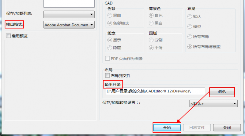 步骤六:在“输出目录”右侧的“浏览”里选择好保存文件的路径位置。接着点击“开始”,对该CAD文件进行转换成PDF格式操作。如下图: