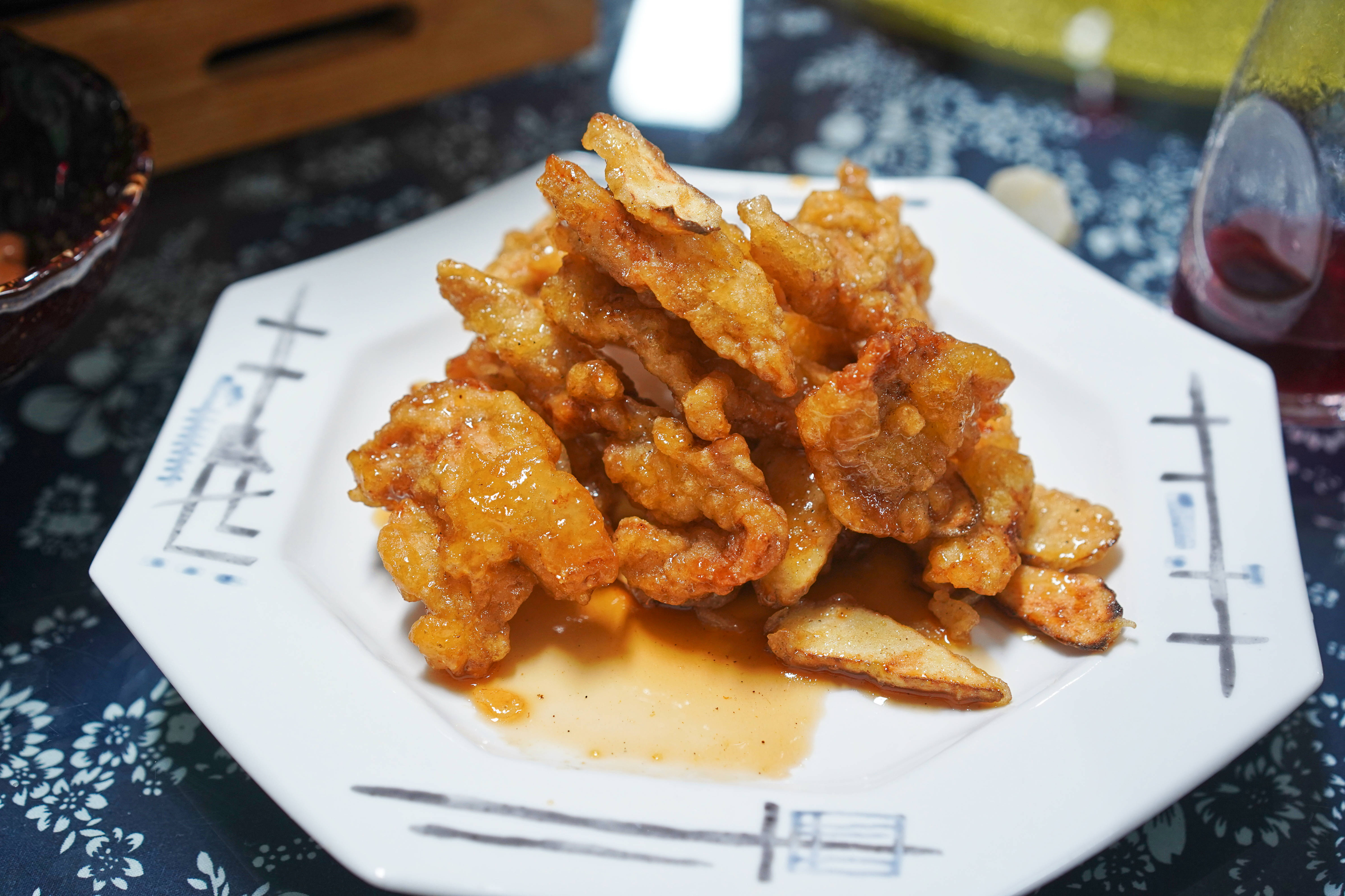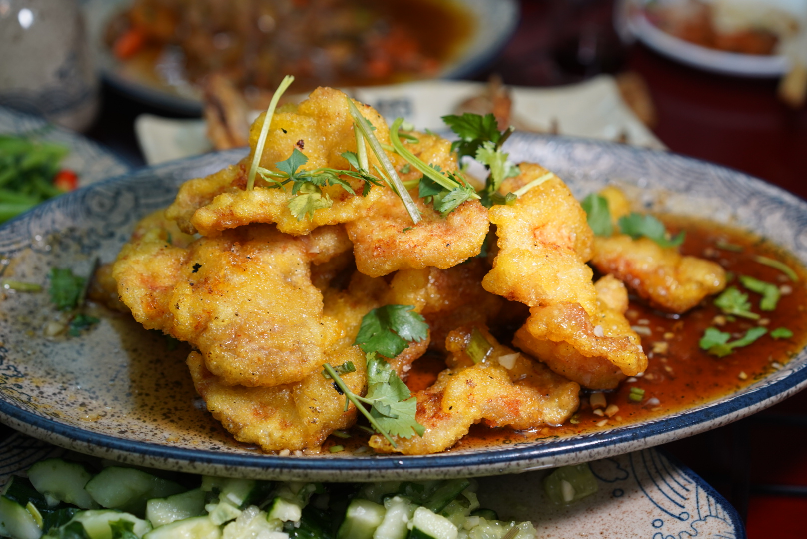 但是这一次吉林之旅,我心中第一名的东北菜变成了锅包肉,有人说锅包肉并不出自吉林,但东北三省的食物本就同根同源嘛。锅包肉其实是里脊肉裹上一层淀粉之类的东西,油酥过后,淋上酸酸甜甜的蕃茄酱,或者是柠檬酱汁。