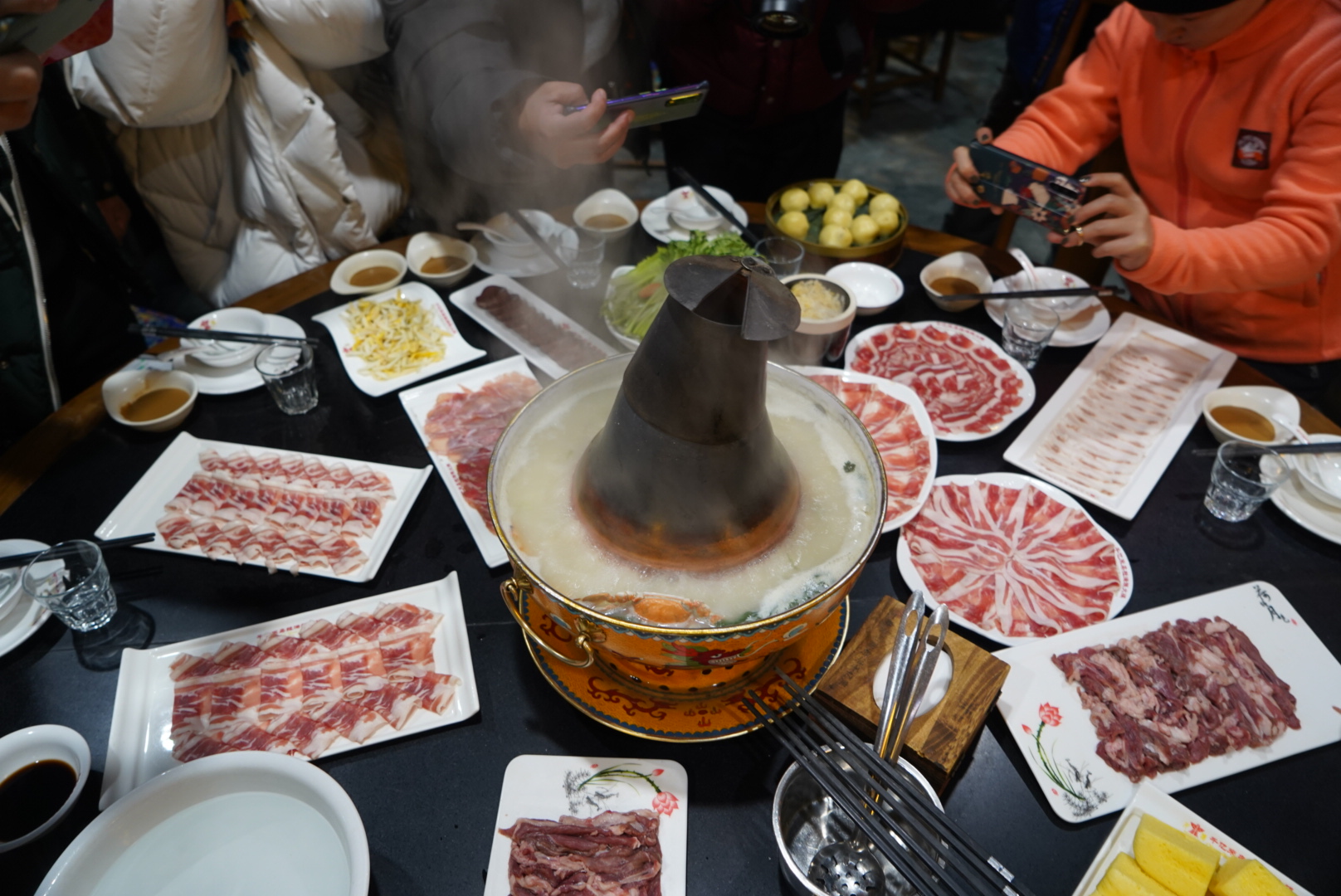 满族乌拉火锅是此行的亮点,这火锅据说是清朝皇帝最喜欢的,但它源自民间,只是被皇家提升了档次,用这漂亮的铜锅煮炖,菜品相当豪气,全是肉,而且都是上好的牛肉、羊肉,再加入东北酸菜、白肉,为了让汤更鲜美,里边还加了几种昂贵的海鲜,别提多好吃了。