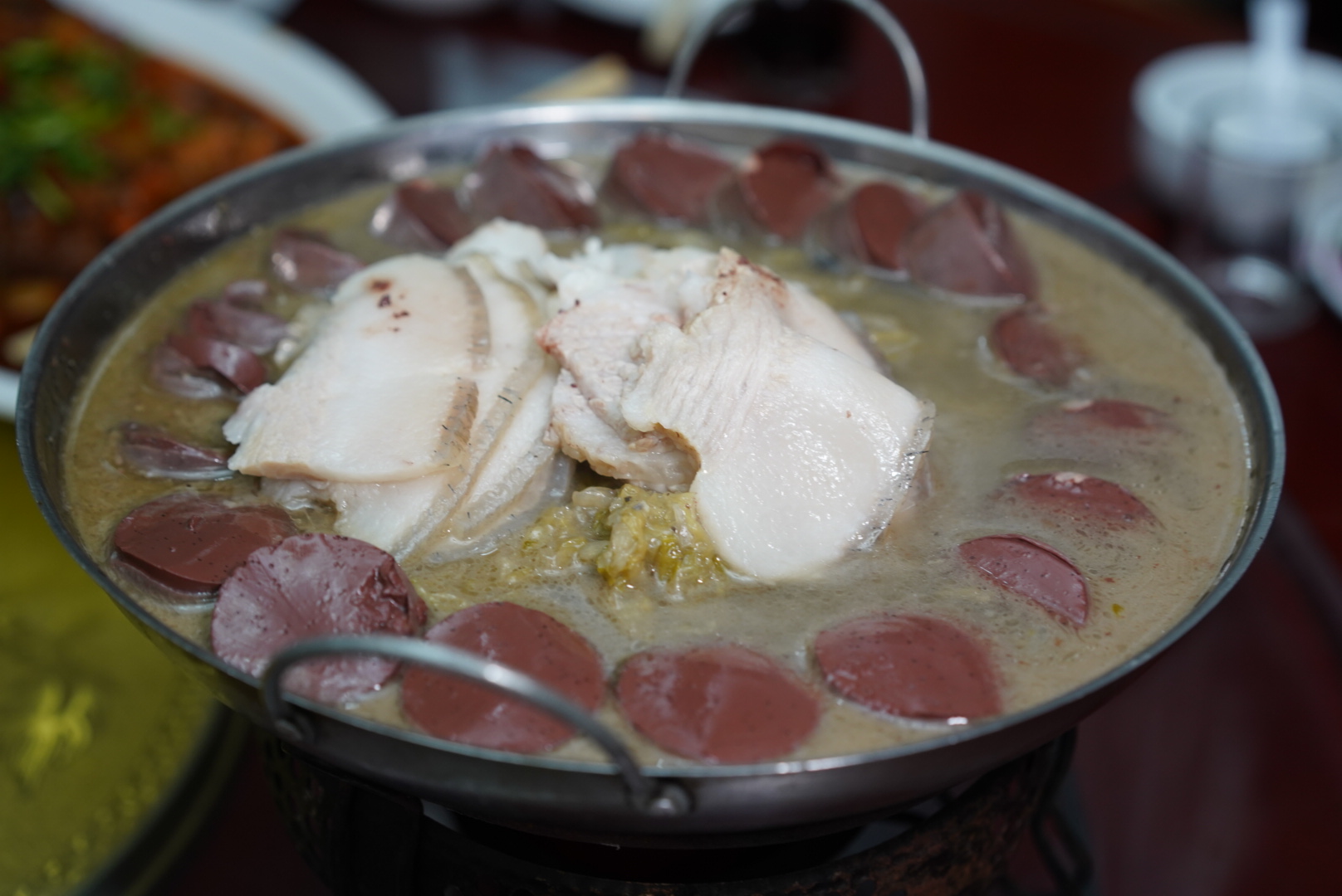 过去几年,我最喜欢的一道东北菜就是酸菜炖血肠猪肉粉条,尤其喜欢那略带酸味的白菜,切成丝,和半肥的肉一起炖,猪肉溶化到酸汤里,不但不腻,反而很解腻,血肠也粉粉嫩嫩的,每次我都能吃几碗酸菜和汤。