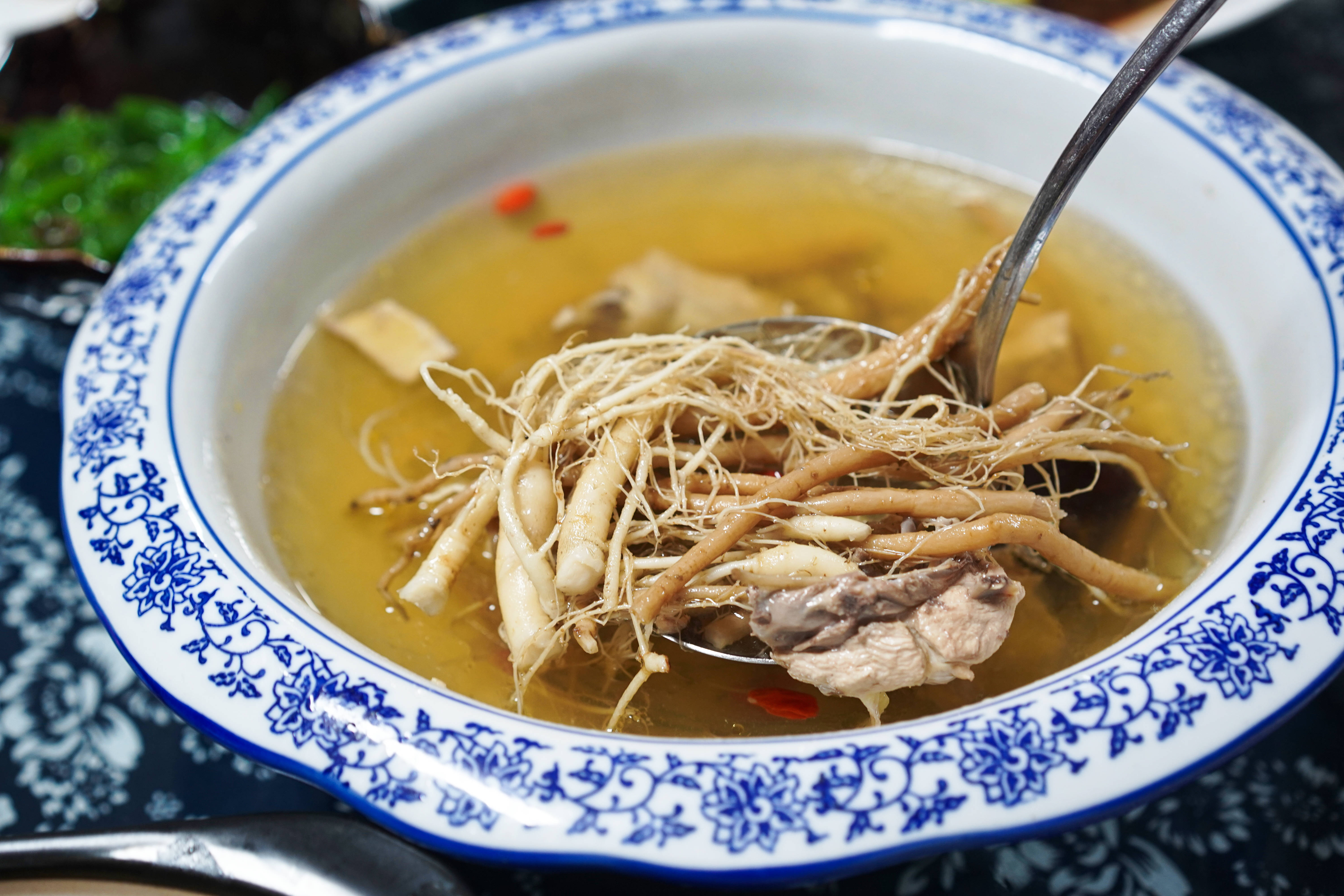 要知道,吉林长白山盛产人参,因此人参鸡汤固然是这里的一大特色,一碗汤里,放了一大把人参,但是并没有传说中的大补过胜,反而很鲜美,药膳味刚刚好。