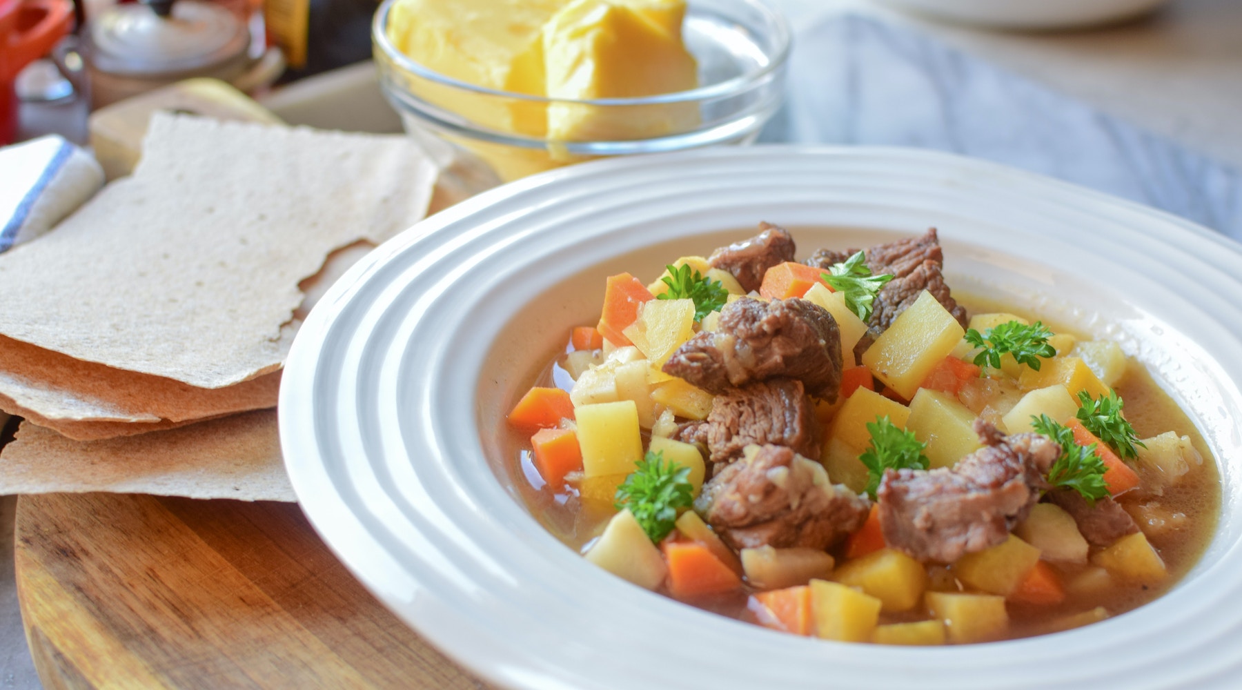 炖菜里还包括土豆、洋葱、胡萝卜、大头菜、芹菜以及各种香料和香草等。