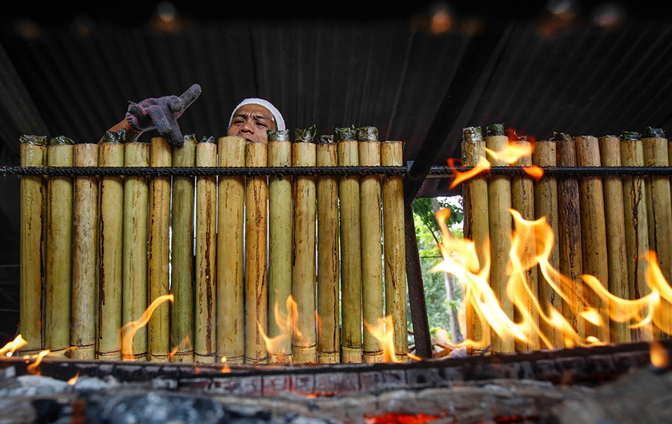 竹筒饭是把糯米和椰奶混合,用香蕉叶包裹然后放在竹筒里煮熟。