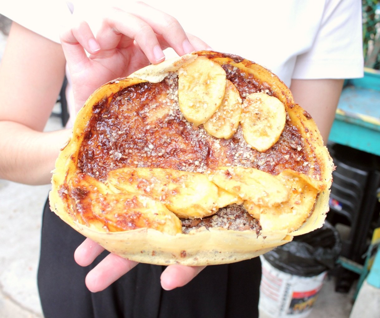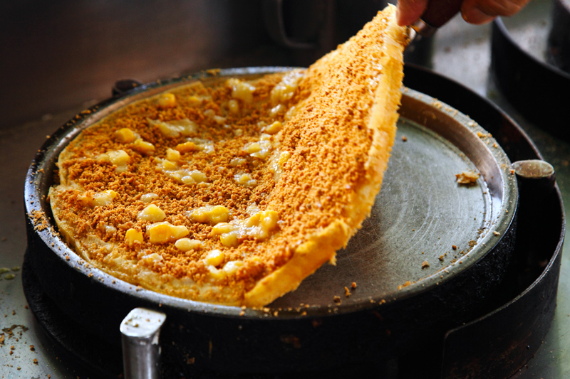 这是煎饼式点心,又有点像鸡蛋饼。曼煎糕里塞满了大量的糖、花生,偶尔还会撒上玉米。