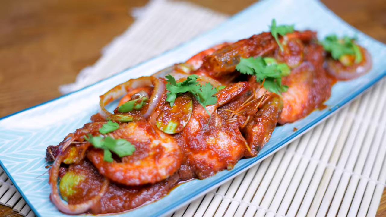 叁巴虾是一种峇峇娘惹菜肴,最早由15和16世纪的中国移民后代发明。叁巴虾就是用叄巴酱调味的虾,里面还加入了罗望子汁,最终的味道为酸辣味。