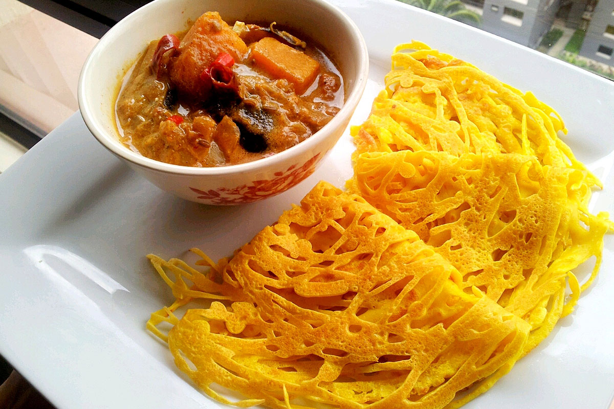 这是土生华人发明的咖喱鸡肉,“甲必丹”是当地华侨首领的头衔,据说是因为有一位甲必丹问厨师:“今天晚餐吃什么?”厨师回答:“咖喱鸡,甲必丹。”