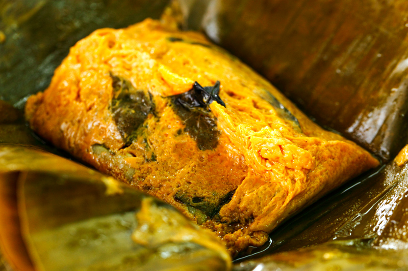 这种烤鱼是把鱼和各种香料混合,然后用香蕉叶包裹,烤制而成。因为里面加入了椰丝,所以具有独特的椰香。