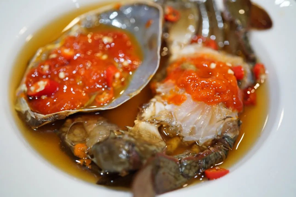 活蟹处理干净,用姜蒜、辣椒、酱油、酒等等调成腌汁浸泡。大刀斩块,蟹肉细润晶莹,蟹膏凝作橙红的流心!