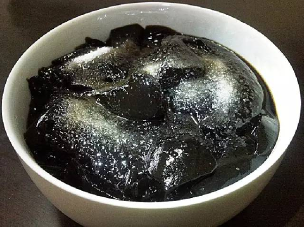 用仙人草(也叫草粿草)煮出黑色汁液,混入淀粉加热再凝冻。眼巴巴看着卖草粿的小贩从大桶里舀出几勺,撒上糖粉,凉滑又清甘。