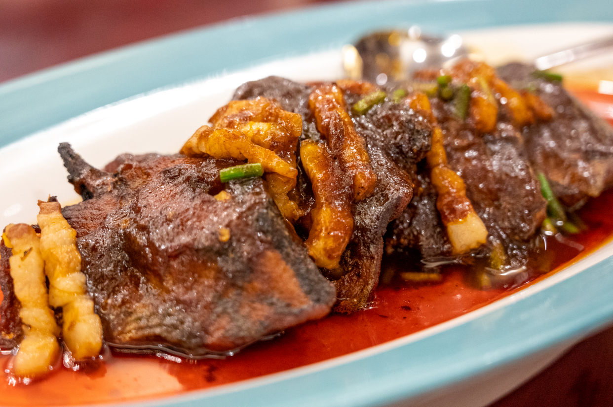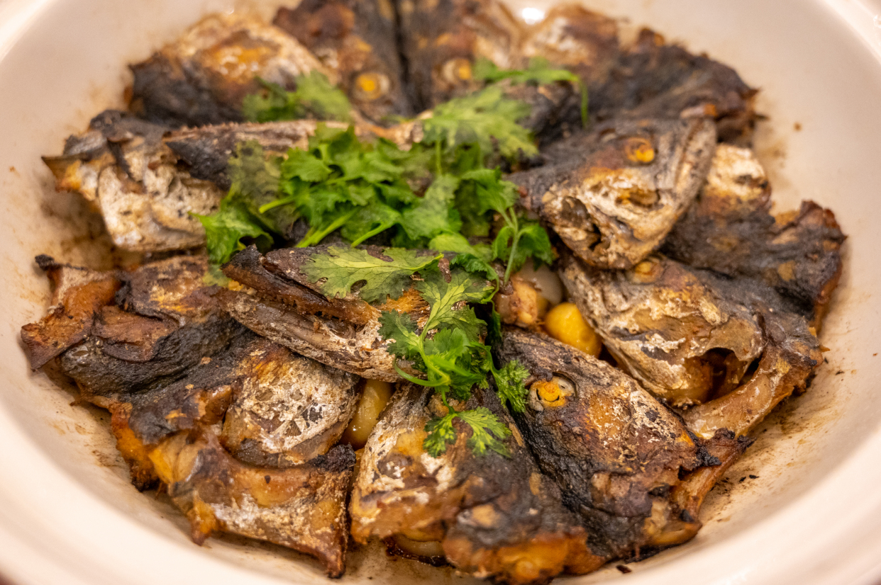 这一大桌子菜品十分丰富,有咸鲅鱼蒸萝卜干、鲅鱼烧白菜、家炖大鲅鱼、鲅鱼籽炖豆腐、鲅鱼丸子、生炒鲅鱼腩、老式锅包鱼片、青椒烧鱼肚……吃起来口感细腻、老少皆宜,是到营口必品尝的美食宴席。