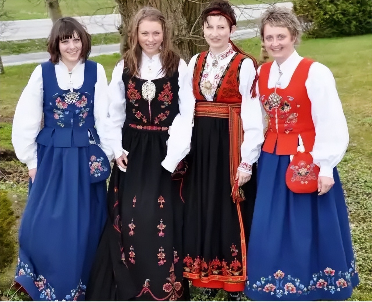 当地传统服装多是黑、红、蓝配色,再加上精美的花边,比如女子服饰多是白衬衫加花裙子。