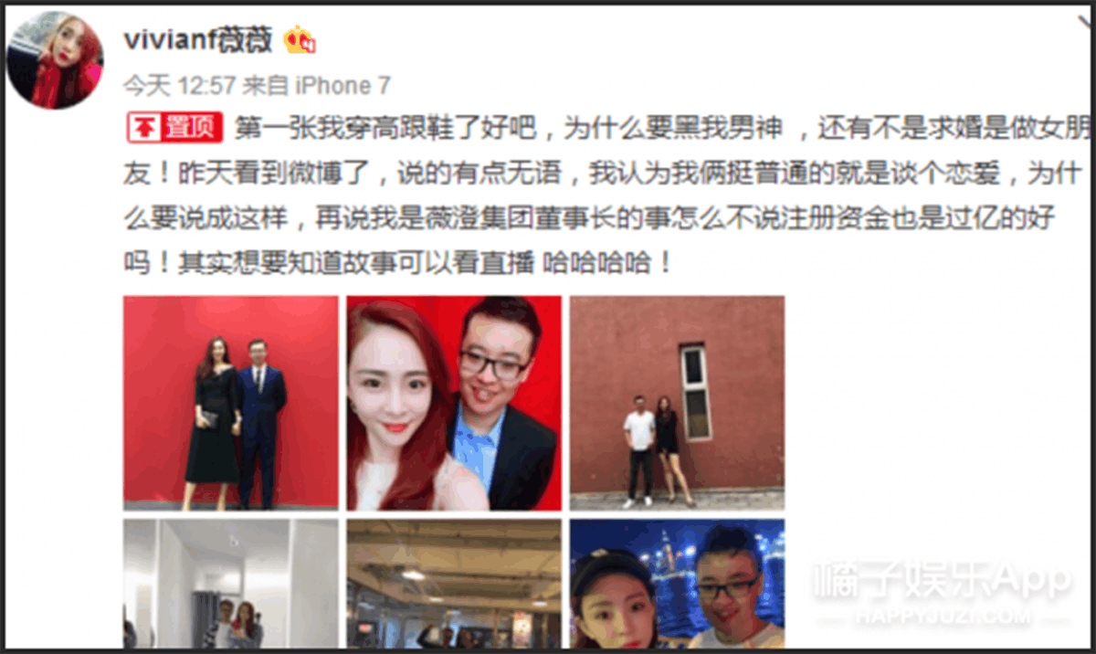 前段时间还一度传出两人结婚的消息,薇薇回应:“没有结婚啦,只是做女朋友。”“再说我是薇橙集团董事长的事,怎么不说注册资金也是过亿的好不好?”