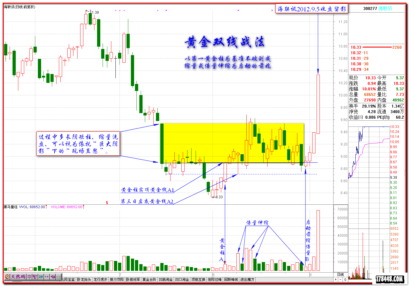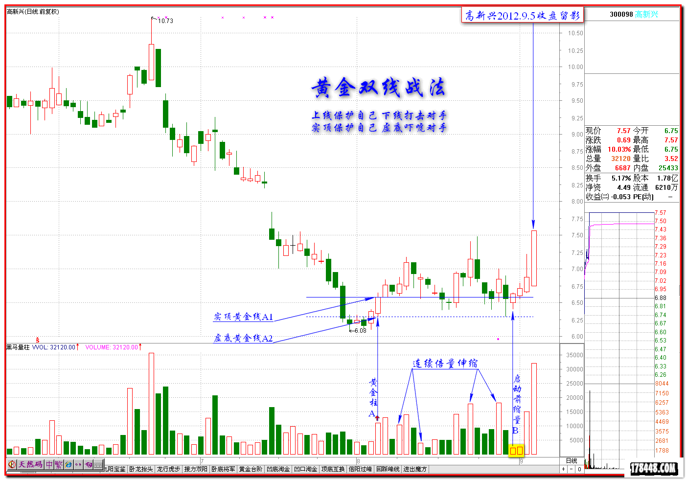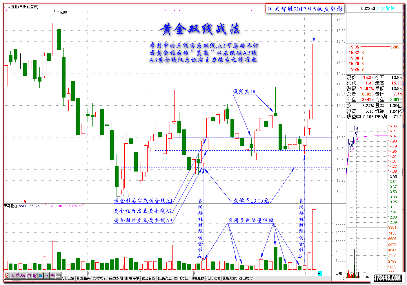 图中A柱为标准黄金柱,依A柱后三日最低实底画线,刚好与A柱实顶重合,所以取A柱实顶画黄金线A1,然后以A柱虚底画黄金线A2(注:A2可以先画在A柱的实底上,然后根据主力的动作做适当调整。本案中的A2就是根据B柱前一天“长腿踩线”的动作,调整到A柱虚底的)。 当这两条黄金线画好后,主力的攻防动作和意图就一目了然了: 黄金线A1(上线)是保护自己的,A柱右侧所有的打压都与A1线不即不离,即使偶尔击穿又很快收上去,说明主力非常看重A1线的得失。黄金线A2(下线)是打击对手的,B柱前一天的“长腿踩线”最低点刚好回踩A2线即迅速收上去,再度回到A1线的势力范围。 再看AB二柱之间,多是长阴短柱和倍量伸缩,这个区间就是打压蓄势区间,B柱倍量收缩,次日量平价升,是启动的前兆。果然,B柱后第三日开盘后10分钟即封死涨停。涨停日量柱不足一倍,价柱左侧上方是跳空缺口,没有成交量,次日必有大动作。 A、B两根柱,A1、A2两条线,构成进退自如、攻防兼备的“双线系统”,就是我们所要讲的“黄金双线战法”。 第二节、设置“黄金双线”的秘诀 我们在“金线战法”里专门讲解了“黄金线”的五种基本画法: 一是“以黄金柱后三天的实底或虚底画线”,即有“虚实”两种画法; 一是“以黄金柱自身的实顶、实底、虚底画线”,即有“实实虚”三种画法; 这五种画法,到底以哪种画法为准呢?我们多次强调过:黄金线的基本画法只是我们的提前“预期”,“预期”的目的是提前“预判”主力将要怎么做,如果你的预期与主力的行为一致,这就是正确的预期;否则就是错误的预期。换句话说,我们的一切“预期”都要以主力的“后期”动作为标准,也就是说,正确的画法是主力告诉我们的,主力的行为适合哪条线,哪条线就是正确的。 从这种意义上讲,“黄金双线”就是以黄金柱为依据,以主力的动作为准绳,确认一条“上线”、一条“下线”,然后用这上下两条黄金线来预测主力的行为和方向,从而做出正确决策的“双线系统”。 从第一个案例可知:确认“黄金双线”的上线和下线的位置非常重要,它是决定我们的“双线系统”是否有效的关键。确认“黄金双线”的秘诀就是“先找实,后找虚,微调抓战机”。这句话的关键是“先实后虚,微调找底”。任何“底”都是主力做出来的,当他的底没有做出来之前,我们的任何主观臆测都是不可靠的,所以,我们要根据主力的行为及时调整“下线”。 请看图15-2“新疆天业2012.9.5收盘留影”: http://att.178448.com/album/201209/09/112003ofs3x3es7yx34xki.png