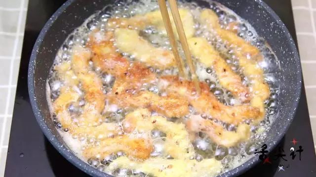 锅中倒油,待油温78分热时,放入鸡柳煎炸至两面金黄