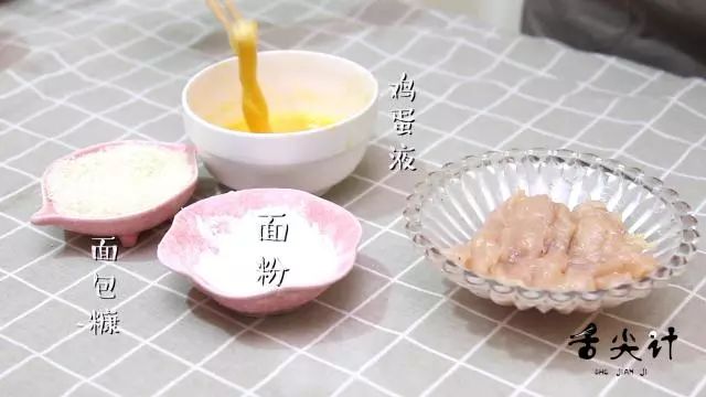 腌制完成之后,夹出一根鸡柳,先裹上一层面粉、再裹上一层蛋液、最后再沾满面包糠,注意要多沾一点面包糠哦