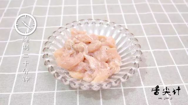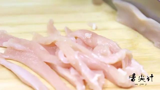 先将鸡胸肉洗净后切条,大致为拇指宽度