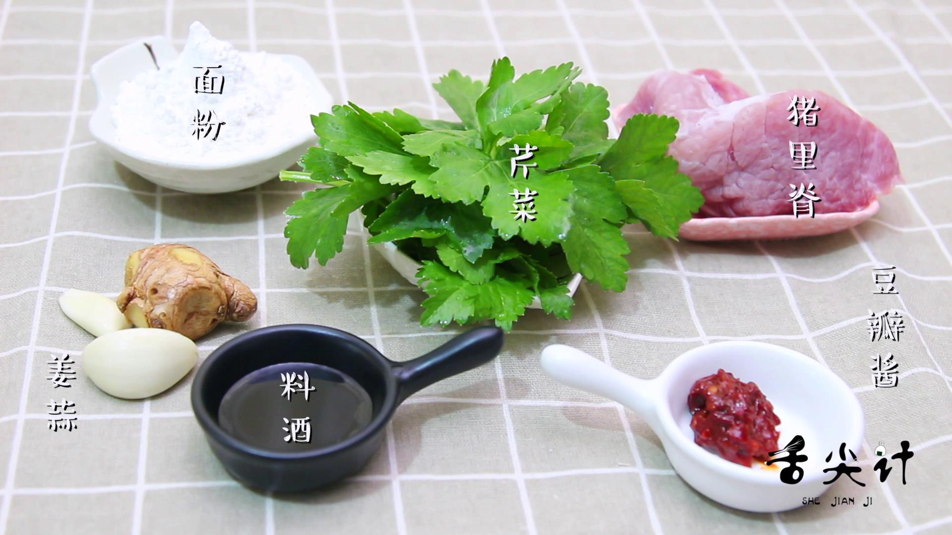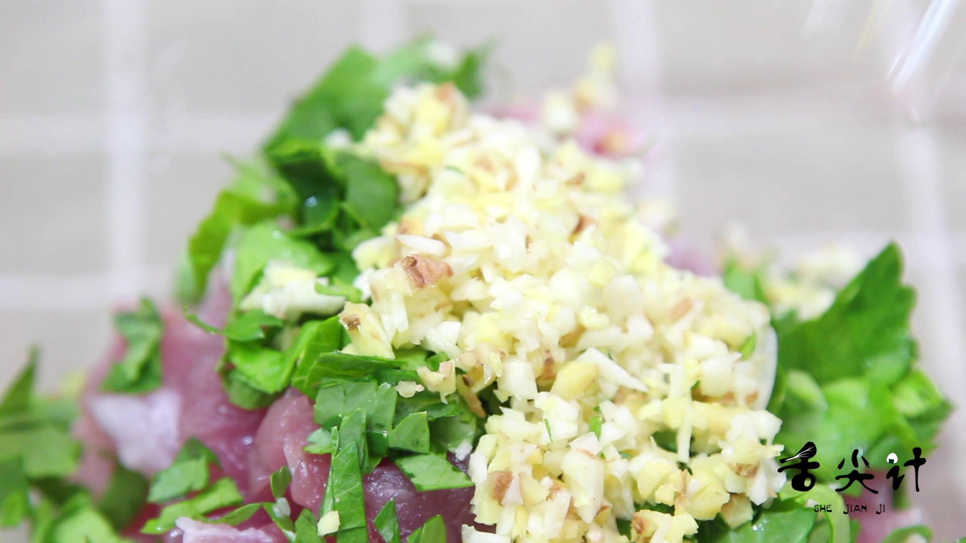 将猪里脊切成小片,芹菜叶切碎,姜和蒜都切成末,让他们在一起