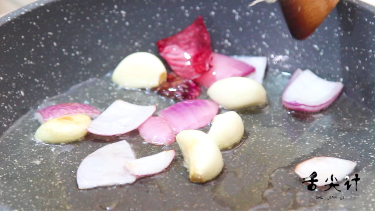 6.锅内烧油,加入独蒜和洋葱片炒香,炒香后装出
