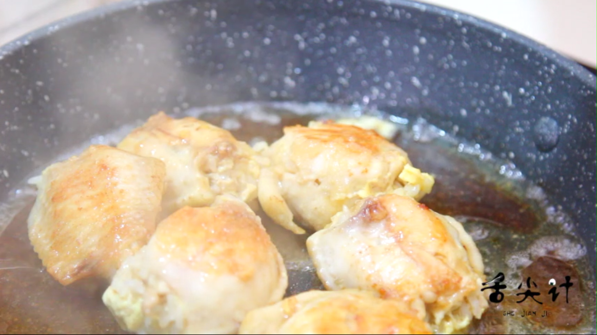 7.将蒸好的鸡翅倒入锅中煎至表面发黄,再倒入之前调好的酱汁