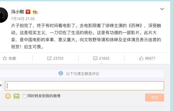 “片子拍完了,终于有时间看电影了。去电影院看了徐峥主演的《药神》,深受触动。这是现实主义,一刀切在了生活的病处。这是有功德的一部影片。此片大卖,是中国电影的幸事,意义重大。向文牧野导演和徐峥及全体演员表示由衷的祝贺!后生可畏。”