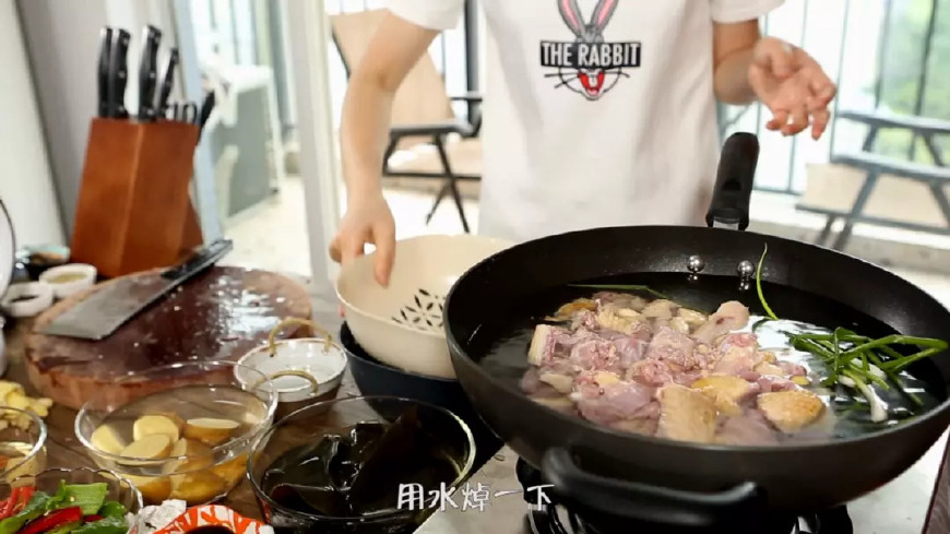 第四步:把鸭肉倒入冷水中,等把血水泡出后再捞出来,然后放锅里,放姜片小葱,焯一下水。