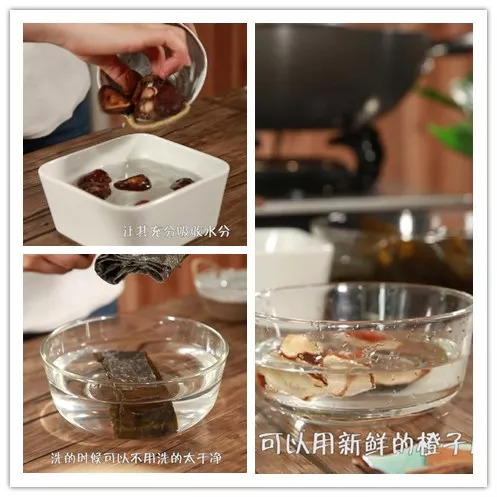 第一步:先把小干香菇泡水,让它充分吸收水分。干海带不用洗太干净,上面的白色粉末不是污垢,和啤酒鸭一块儿煮会提升鲜味,剪成方块后用冷水浸泡。陈皮也需要清洗一下,如果家里有新鲜的橙子,可以用新鲜的橙子皮来代替陈皮,取一半的皮用就可。