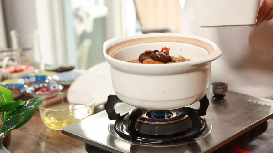 第八步:啤酒鸭连汤带锅倒入砂锅,加入陈皮、泡发的香菇,小火炖约1小时。陈皮的清香和香菇特有的菌味,能很好的盖住鸭子本来的膻腥。