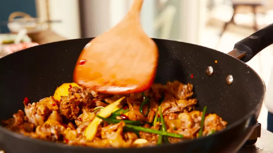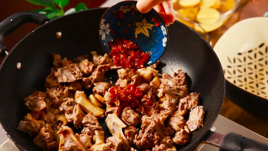 第五步:起油锅,鸭肉入锅,慢慢翻炒至上色,充分煸出鸭油,再把鸭肉拨到锅的上端,露出锅底的圆,倒入豆瓣酱和糖,小火翻炒出香味和糖色。