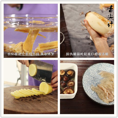 第一步:把木耳和腐竹提前放水浸泡,别泡太久,泡久了会影响口感。刮掉藕上的外皮,切片,别切太厚(这儿选择的是脆藕,粉藕不适合做麻辣香锅)。土豆切片,切厚实一点。香菇切花,去其根部,在其表面切出一个十字花。魔芋切条,在条中间花开,再从里翻转过来,就成了麻花状的魔芋。