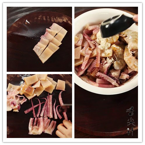 第二步:把海鲜处理干净。青虾剪掉虾须、虾眼,切开虾背把虾线给清理掉。鱿鱼切小块,爱鱿鱼脚的我是不会把它切烂了,只切它的上半身。虾和鱿鱼可放一点米酒、生抽、香醋腌制一下,这样才更好的去腥入味。