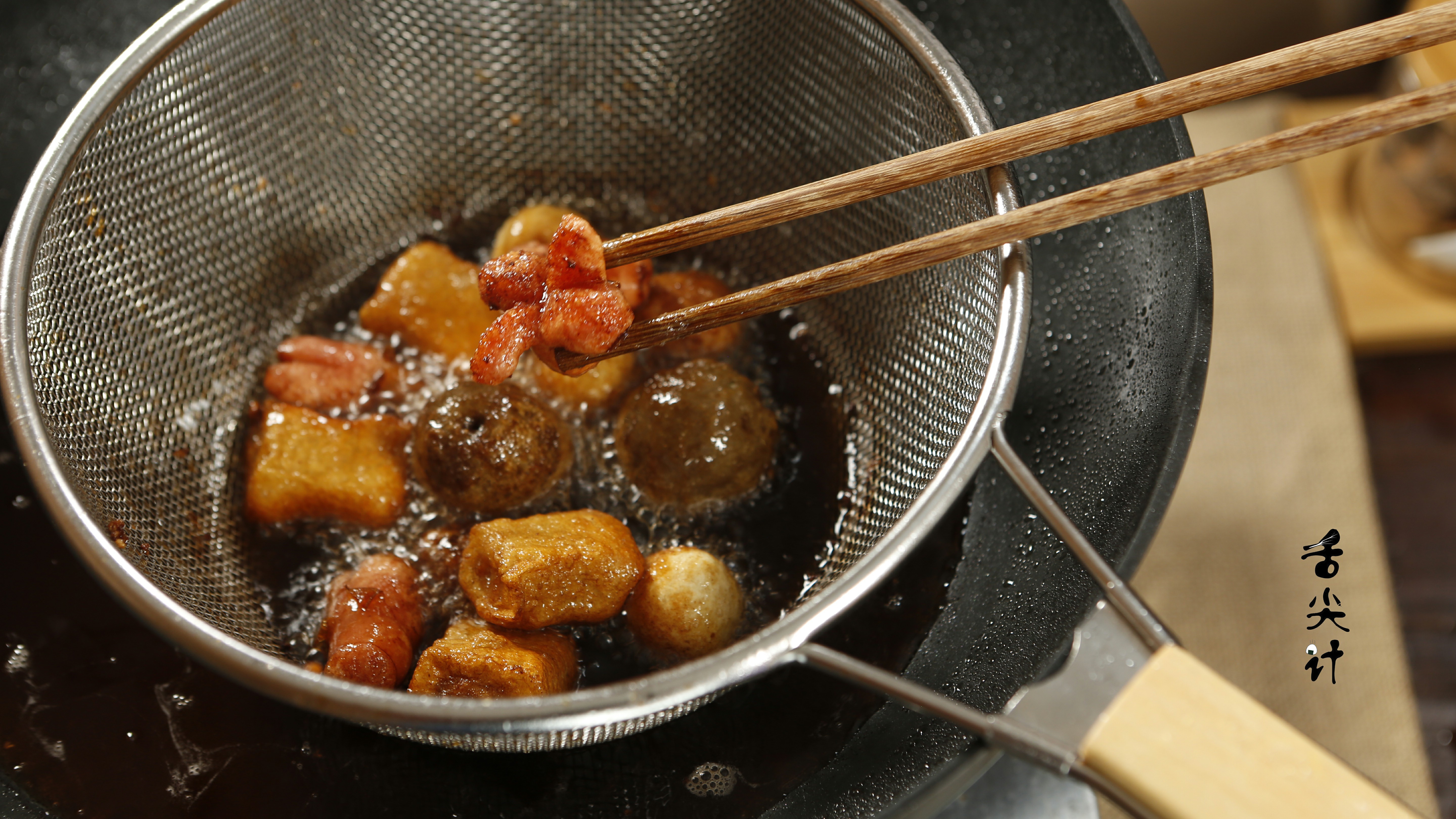 第五步:热锅上油,把虾、鱿鱼、鱼豆腐等荤食油炸至酥脆,捞出。