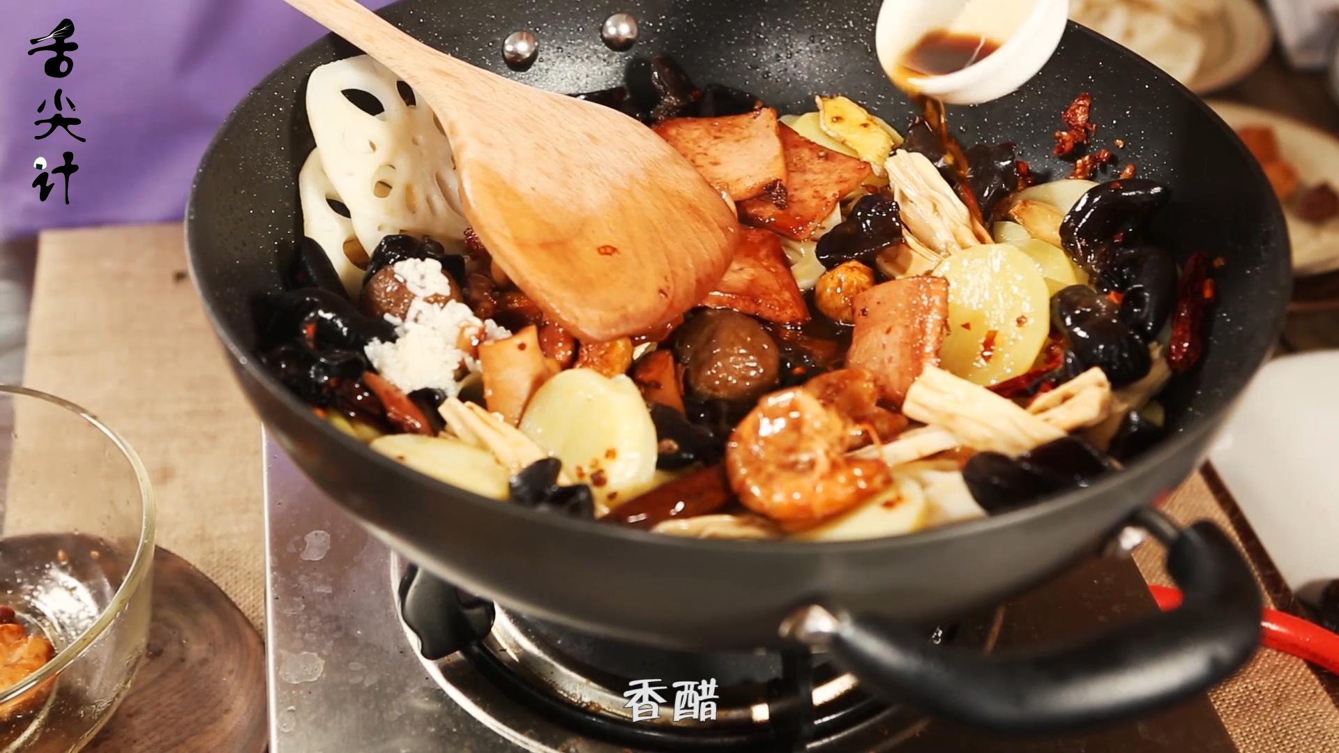 第七步:按照藕片、土豆、木耳、腐竹、香菇、荤食这一顺序后下菜,再倒入米酒,香醋开大火翻炒。