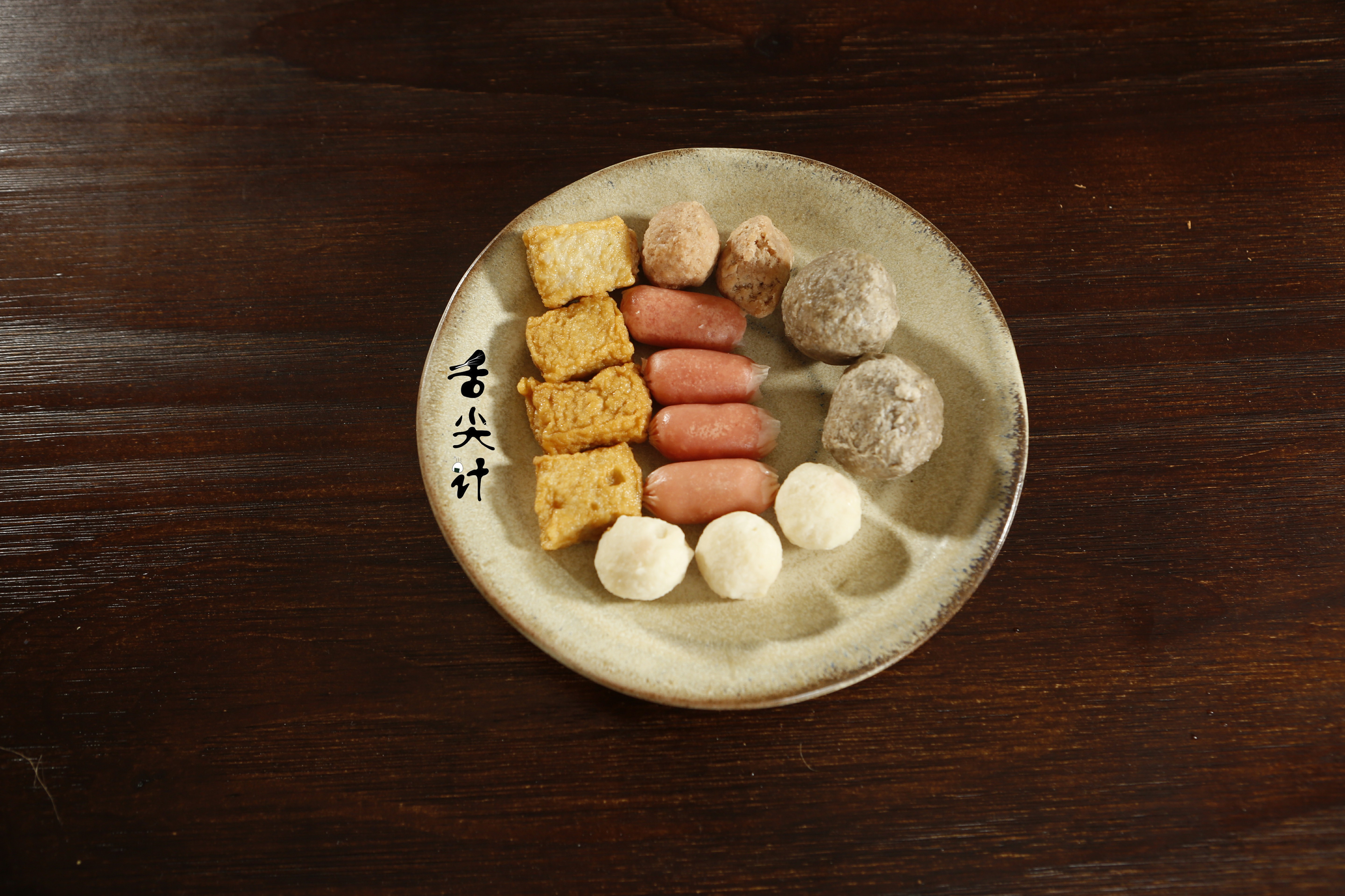 第三步:午餐肉切片,鱼豆腐斜切、鱼丸切两半、小香肠切十字花。