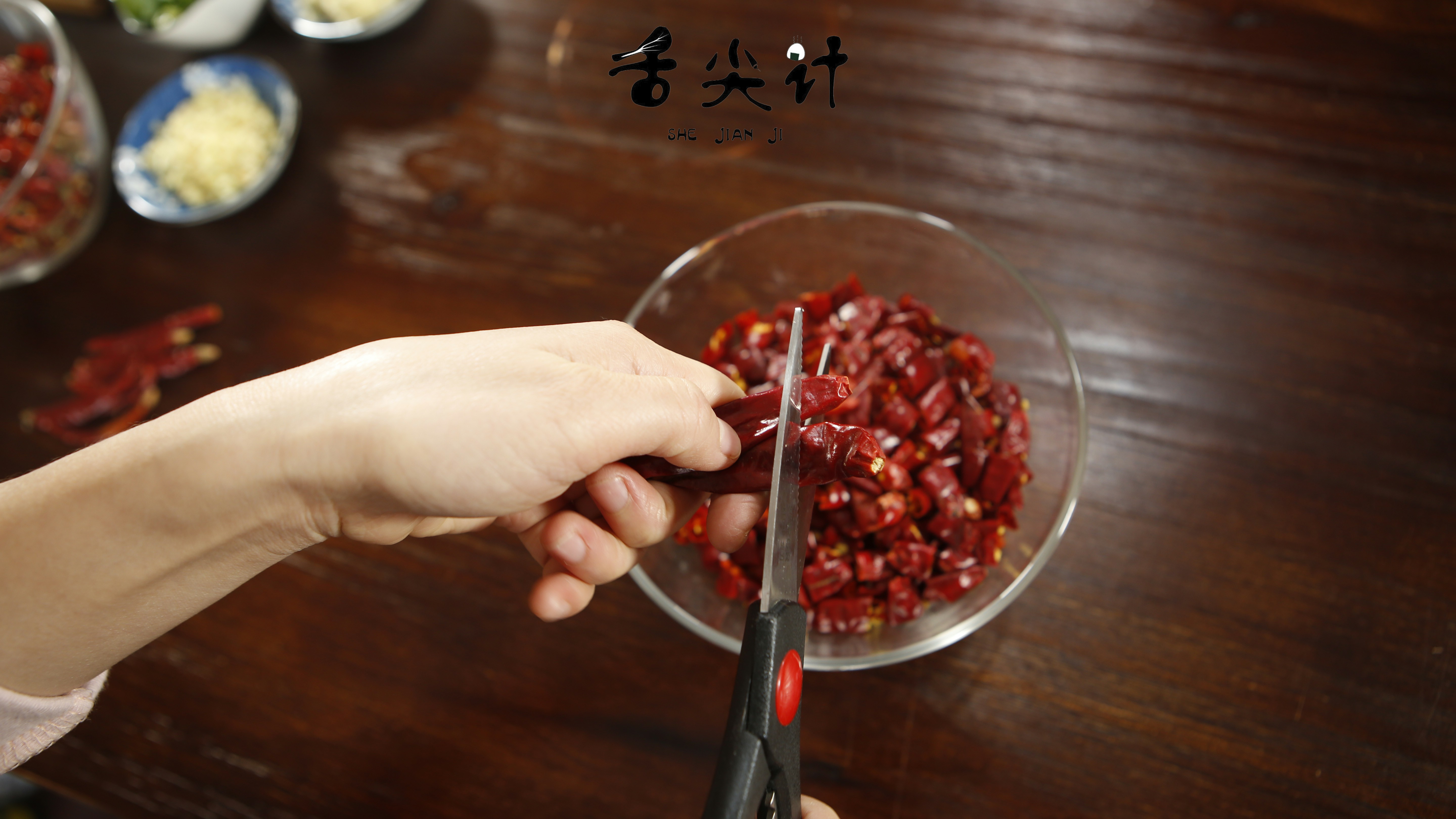 3、把姜蒜切末,小葱切断。辣椒剪短后,倒入开水浸泡,这样做的好处是能让辣椒的辣味和香味更好的渗透出来,而且泡过水的辣椒在炒的过程中也不宜炒糊。