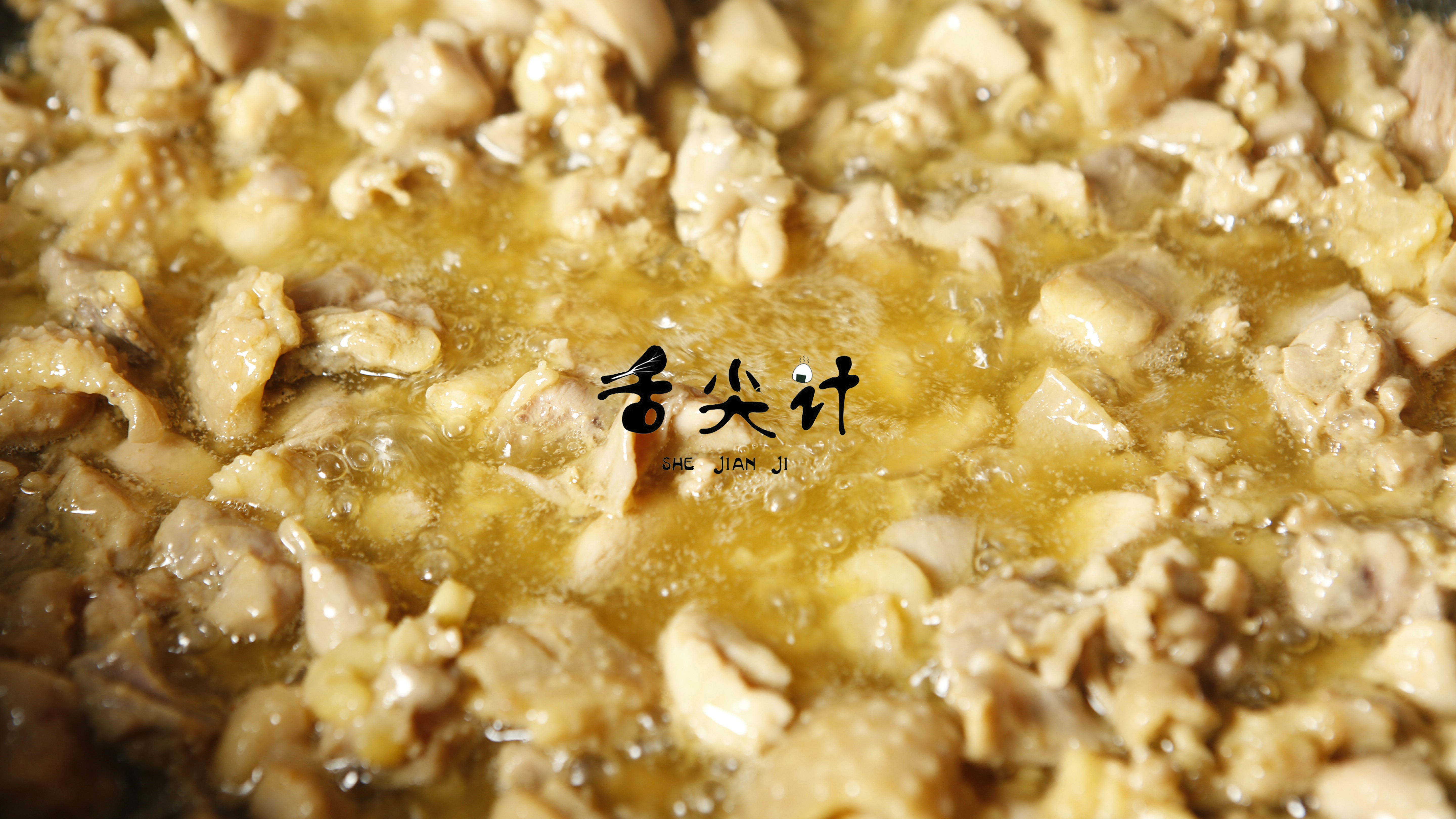 4、开火下宽油(油多一些),油温烧自7成热时(这里告诉大家油温该如何判断,7成热油温锅中会冒出大量青烟),把腌制好的鸡肉下油锅,开中火炸2分钟,鸡肉定型后捞出,现在炸过的鸡肉并没有很酥脆,我们还需要炸第二遍。将油温烧自8成热后,下鸡肉炸1分钟后捞出,此时炸过的鸡肉就很金黄酥脆。