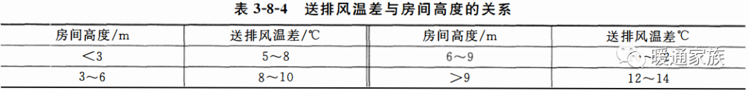 (4)送排风温差的确定当室内发热量已知,送风量已确定的情况下,送排风温差是可以计算得到的。在置换通风的房间内,在满足热舒适性要求条件下,送排风温差随着顶棚高度的增高而变大。欧洲国家根据多年的经验确定了送排风温差与房间高度的关系,如表3-8-4所列。