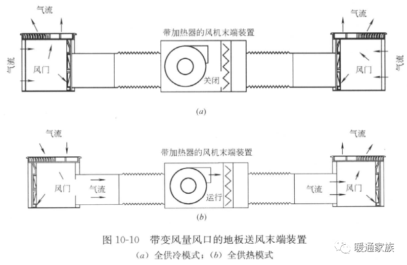 该末端装置适用于有压静压箱的地板送风空调系统。它可用于供冷和供热运行。在供冷模式时,风机末端装置关闭,所有风口在正常的变风量模式下工作,向室内输送来自地板静压箱内的冷空气(图10-10a所示为全供冷运行模式)。在供热运行时,风机型末端装置被触发运行,通过一个地板风口吸入来自室内的回风,又通过另一个地板风口送风至室内。图10-10b所示为地板风口调节风阀位于全供热的位置上。在实际运行中可设置一个调节风阀定位装置,以提供来自静压箱的最小通风量。在温控器的控制下,室内空气提供了第一阶段供热,然后触发和调节加热盘管。这种外区解决方案不需要在地板下设分隔。