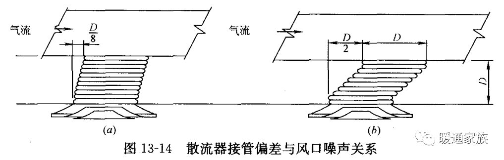 送风散流器的安装偏差也会影响噪声值。散流器生产厂家对散流器进行标定时,接管与散流器垂直相连。在实际工程中,常发生安装位置与测试状况不一致的情况。图13-14为送风散流器的两个安装实况图。图13-14 (a)显示了散流器接管的垂直偏差不超过D/8,图13-14 (b)显示了接管的垂直偏差达 D/2。其结果是,前者的散流器噪声指标与散流器样本数据相符;后者的散流器噪声值可能会比样本值增加12~16dB。