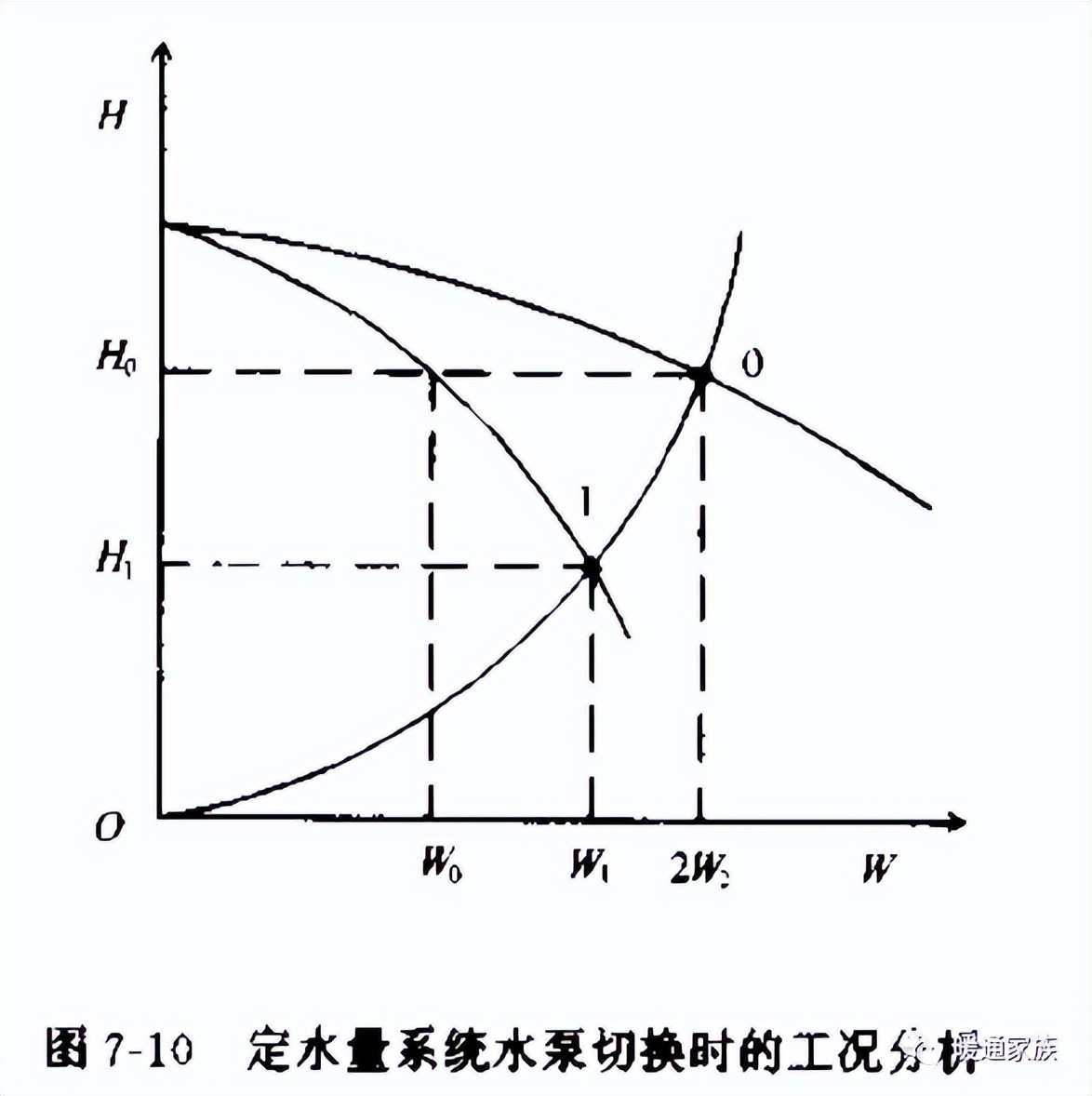这样做解决了供水温度升高的温度。可保证供水温度仍为7。但是,由于负荷侧阻力系数未改变,根据水泵特性及管路水力特性曲线可知、这时水系统的工作点将下移(如图7-10,设计工作点为0点)至1点。此时的系统水流量W1将大于单台泵设计流量W0。而小汗两台泵同时运行的流量2w。这将导致两个问题;