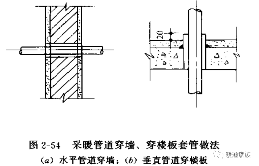采暖管道在穿楼板和墙壁时应做套管:使管道在水平和垂直方向能自由伸缩,同时可避免破坏地面面层及墙面面层。