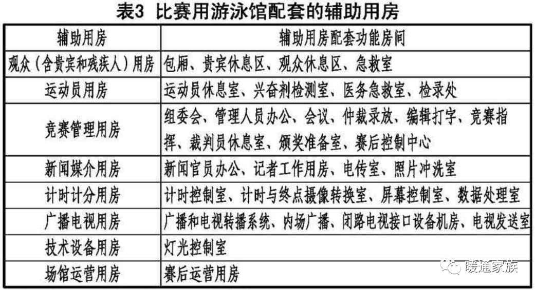 比赛用游泳馆配套的辅助用房见表3。