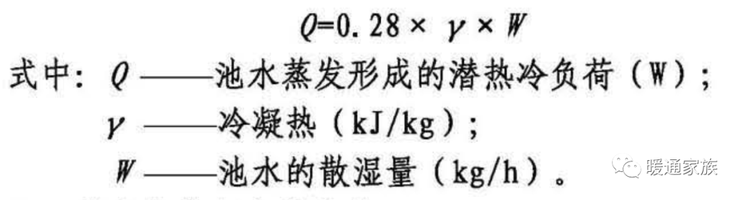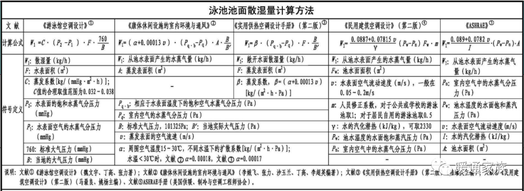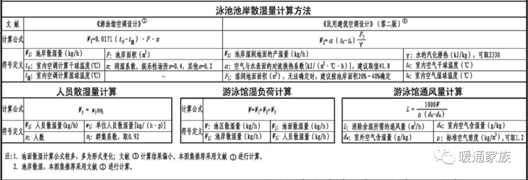 《游泳馆空调设计》、《民用建筑空调设计》( 第二版)给出了池岸散湿量计算公式,详见下图泳池散湿量及通风量计算。
