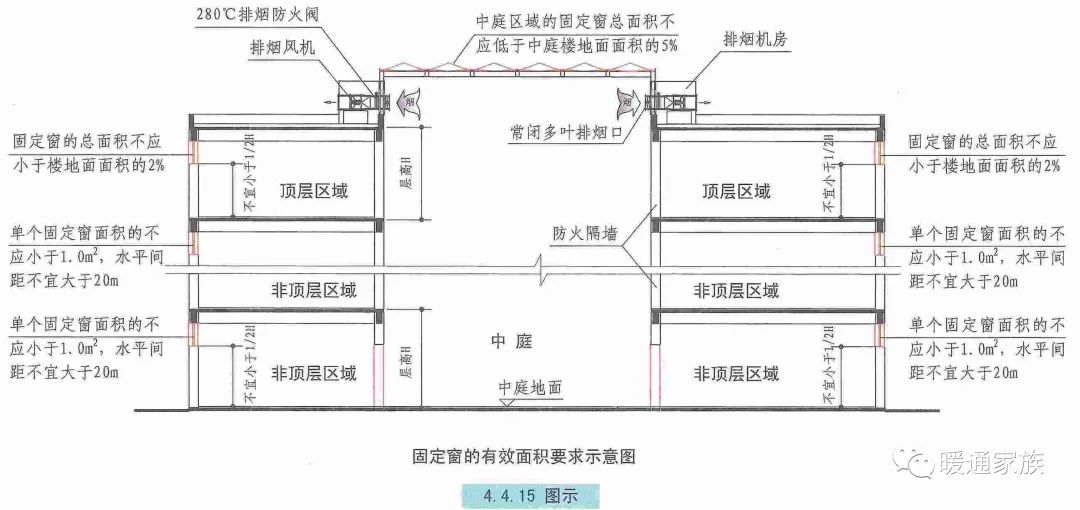 【特例】对于非商店建筑中庭回廊,周围场所均设置排烟设施时,回廊可不设置排烟设施。