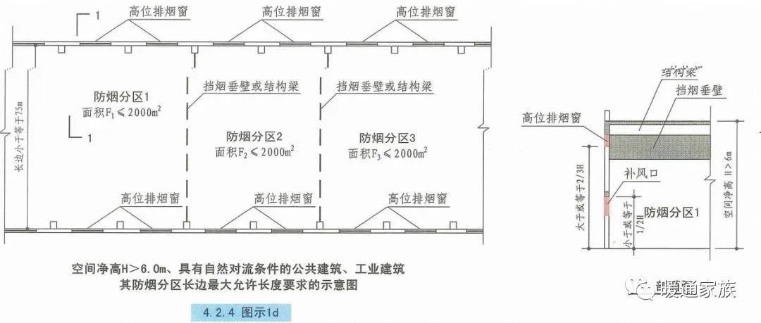 3、空间净高大于6.0m时,防烟分区最大允许面积为2000,长边最大允许长度为60m;具备自然对流条件时﹐不应大于75m。