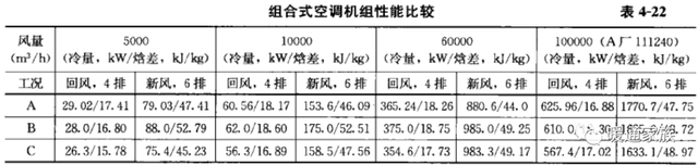 、组合式空调机组换热盘管的换热量应根据设计水温和温差进行选型计算,国家标准《组合式空调机组》GB/T 14294对盘管换热量的计算有详细的规定(见《组合式空调机组》附录E)。设计人员不要完全依赖设备厂家的样本,因为各设备厂的实验条件不同,彼此之间的数据相差很大,现以A、B、C三家品牌为例介绍如下(见表4-22)。
