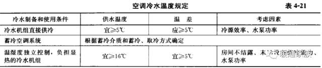 空调冷热水水温是空调系统设计的重要参数,一般选用两个指标:供水温度和供回水温差,前者决定传热的水平,后者决定冷热水流量的大小。空调冷热水水温应根据冷热源装置、末端设备、循环水泵功率、运行能耗及长期经济性等因素确定,国内的学者对各种不同使用条件下空调冷热水的供水温度、供回水温差及考虑因素进行了长期的研究,达成了共识,反映在最新的国家标准《民用建筑供暖通风与空气调节设计规范》GB 50736中,见表4-20和表4-21。